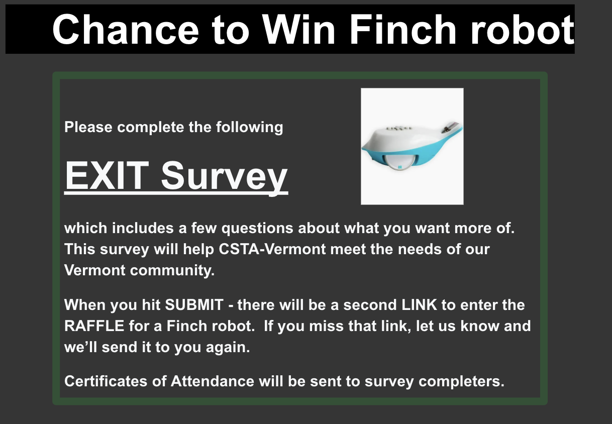 Simple watch one or more video highlight below and then complete this short CSTA-Vermont Exit survey. As soon as you hit submit you will get an email with the link to a special Birdbrains raffle for a Finch robot (exclusively for participants of this event - the odds are in your favor! Deadline Friday, March 27.