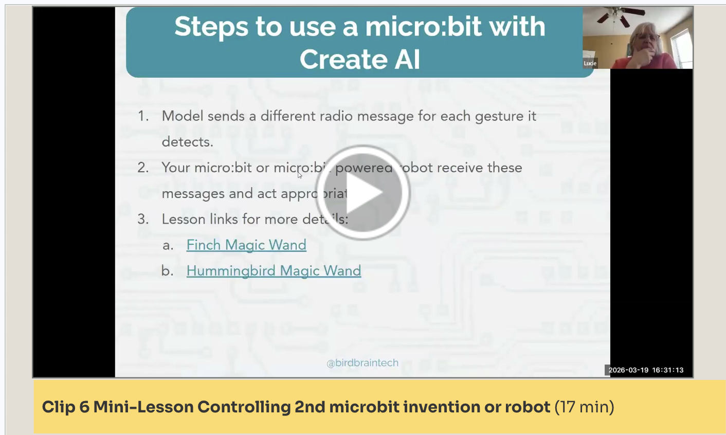 This lesson leveled up to integrate the two previous lessons and by the end of it we were able to train AI and code a microbit to control an second microbit embedded in a student created project or to control any robot with an embedded microbit. (like the Finch)