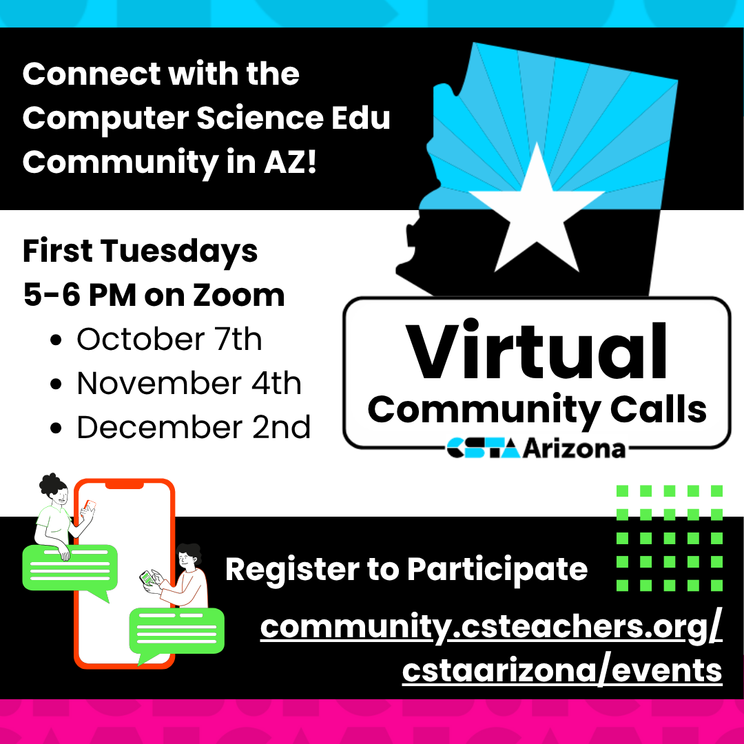 CSTA-Arizona hosts monthly virtual community calls to maintain connections with Arizona CS educators and stakeholders. It is a chance to hear about projects happening with CS in Arizona and connect with potential collaborators or teachers in your region. The call structure is informal and community-led.
