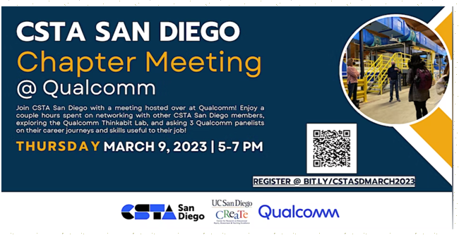Qualcomm will be hosting our Regional Meeting on Thursday March 9th. It will be a great evening of networking with other CS instructors and professionals and learning about San Diego's largest tech employer. And yes, snacks and swag will available! Let us know if you plan on attending the event by responding to this post!