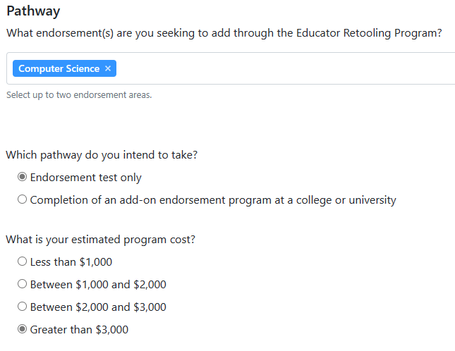 As part of the application, teachers will need to obtain a school administrator's support through their signature on the attached template and fill out either a WAFSA or FAFSA. On the Pathway tab, indicate Computer Science as the endorsement, indicate Endorsement test only as the pathway, and indicate Greater than $3000 as the program cost no matter what the actual personal financial outlay to obtain the endorsement is. Teachers at the STEP CS program at UW will still want to put completion of an add-on endorsement program at a college or university as their pathway.