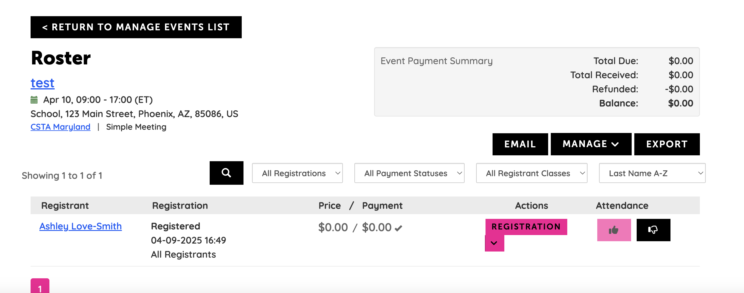 (See images further below) Go to Community Settings, then scroll down to Manage Events. On this page, scroll down to the specific event and then click Edit and select Manage Roster from the dropdown. Next, go down the list of names and click the Thumbs Up or Down to indicate if the person attended. If this is an event with PD hours(credits as the HL system calls them) and you want to make sure the hours appear on the members digital record, please complete the attendance review, then email chapters@csteachers.org with the name and date of your completed event and let us know you want us to upload the information for PD hours.