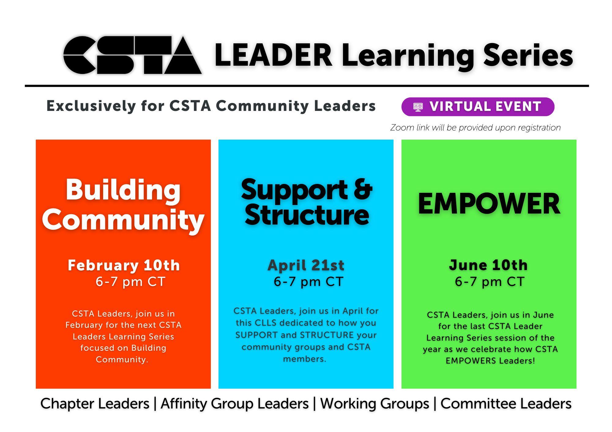 Join us for the CSTA Leader Learning Series! We have a series of sessions we invite you to join for April and June at (4pm PT/6pmCT/7pm ET). To register, go to
